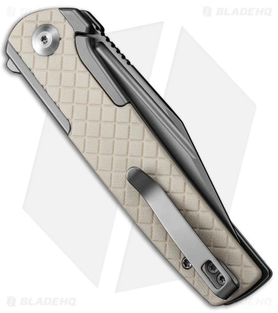 - Steel frame handle with diamond patterned ivory G-10 inlays.