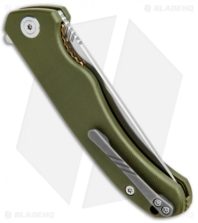 This model of the CIVIVI Courser comes with an OD green G-10 handle and gold stainless steel liners.