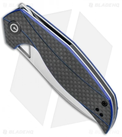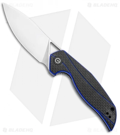 This model of the CIVIVI Anthropos comes with a satin finished D2 steel blade. The handle is comprised of deep blue G-10 with a carbon fiber overlay.