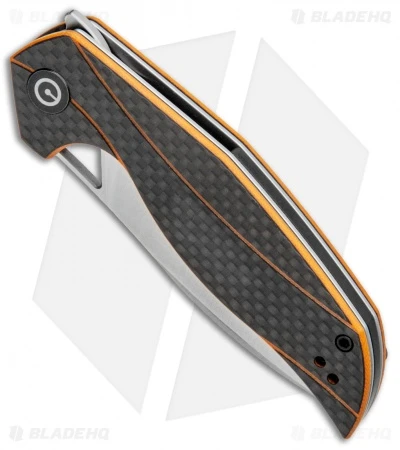 This model of the CIVIVI Anthropos comes with a satin finished D2 steel blade. The handle is comprised of bright orange G-10 with a carbon fiber overlay.